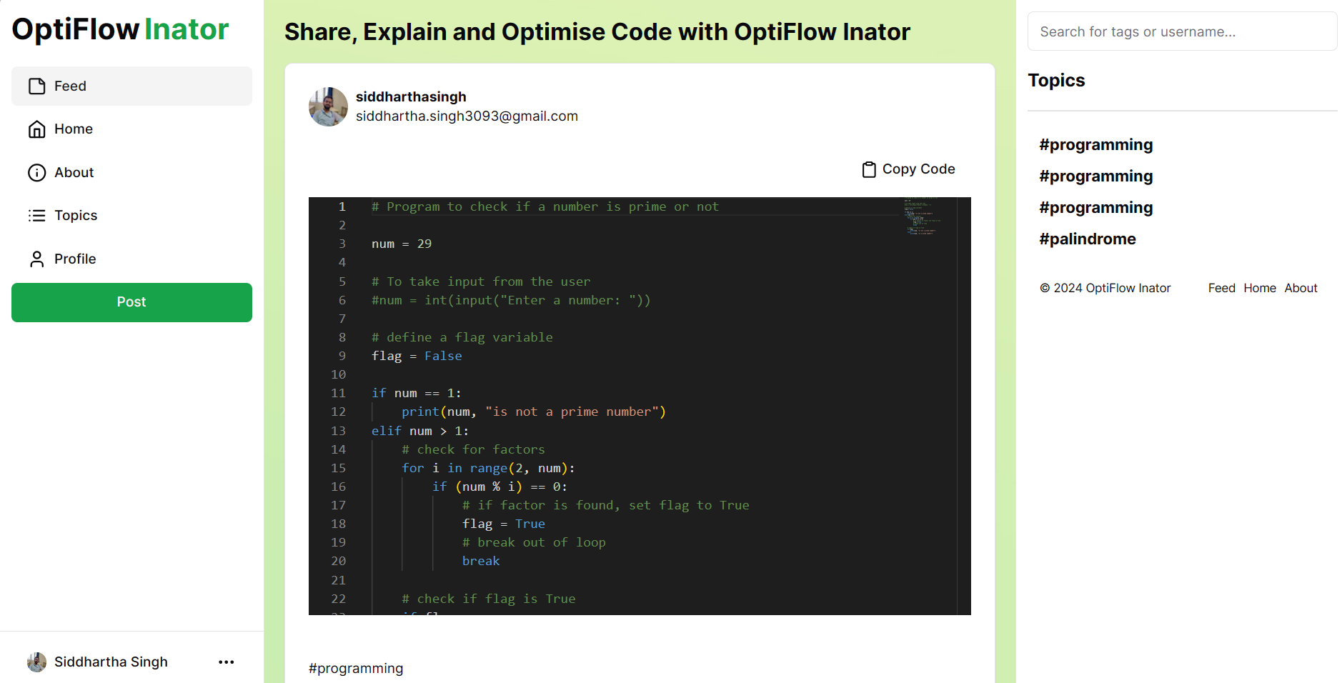 Optiflowinator is a Multiuser Next.js 14 app-directory based application, incorporating the Open-AI API to create, optimize and share code posts within a community feed. With a secure Google authentication using Next Auth, providing multiple login options.